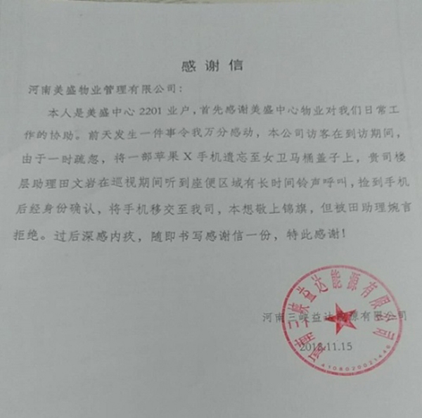 一封來自美盛中心入駐業(yè)戶的感謝信,信中寫到樓層助理田文巖撿到手機(jī)后歸還業(yè)戶,業(yè)戶欲送錦旗被拒絕,發(fā)來感謝信。對于我們來說,拾金不昧、助人為樂是最基本的工作道德,是應(yīng)該做的,無需多言。