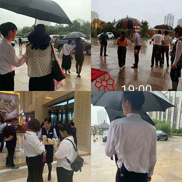 面對眾多業戶因大雨無法回家的問題,美盛物業人自發為業戶提供撐傘服務,寧愿自己全身濕透,也會多給業戶撐一點傘,為業戶送至地鐵或車上,同時還為大堂等待中的業戶送上驅寒熱茶。