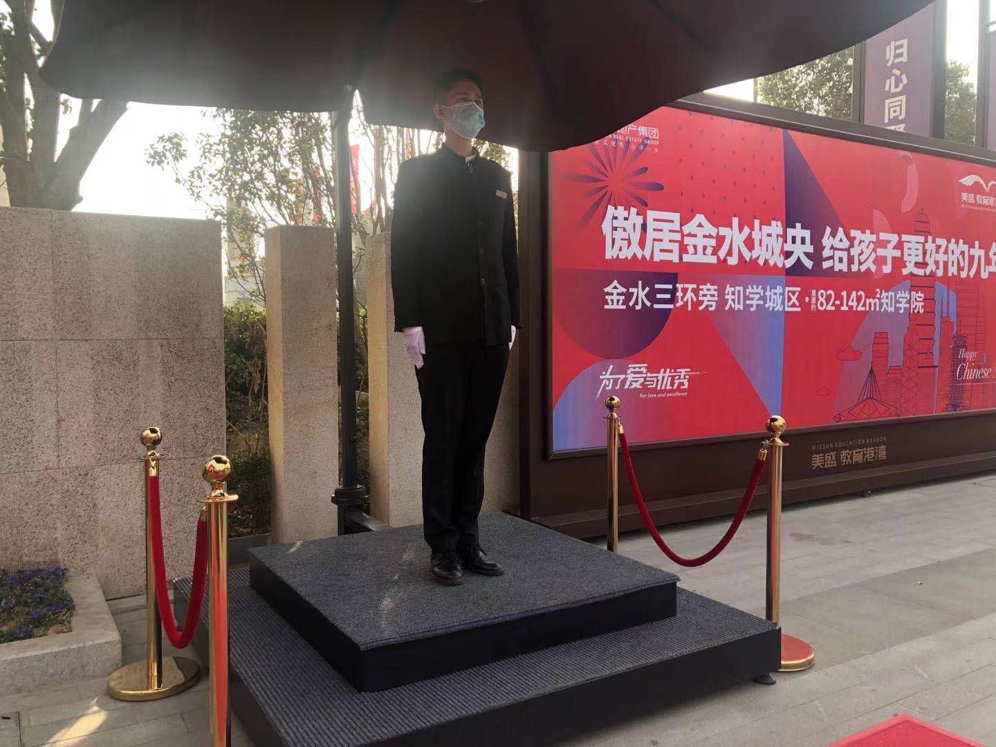 走近教育港灣營銷中心停車場,一個身穿工裝帥氣的大男孩就會出現在您的眼簾中,挺拔的軍姿,標準的敬禮再加上一句“  您好,歡迎參觀美盛教育港灣! ”