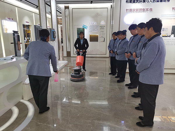 保潔員們依序清洗滿地業(yè)主的地墊,管家們在一旁與業(yè)戶分享清洗地墊、雜物的小妙招。